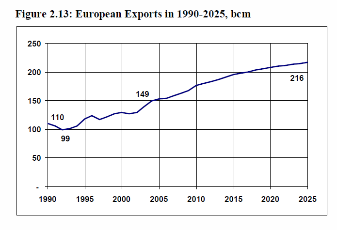 Figure 2-13: European Exports in 1990-2025, bcm