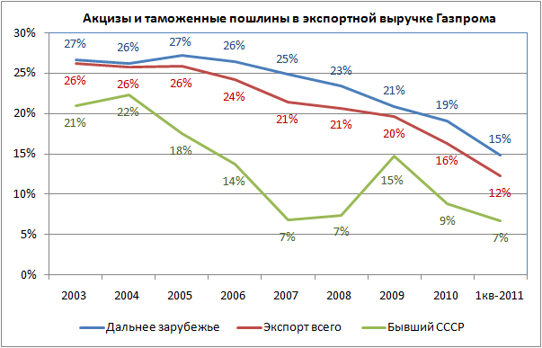 таможенных пошлин (и акцизов до 2004 года) в валовой экспортной
