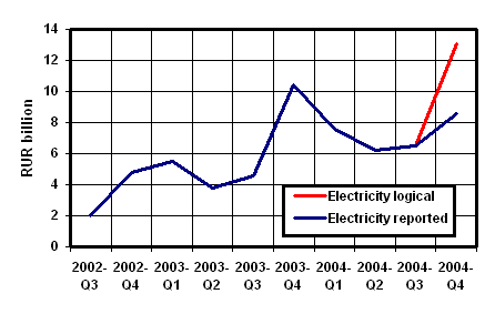 Reported electricity expense in Q4-2004 is lower than in Q4-2003, which is