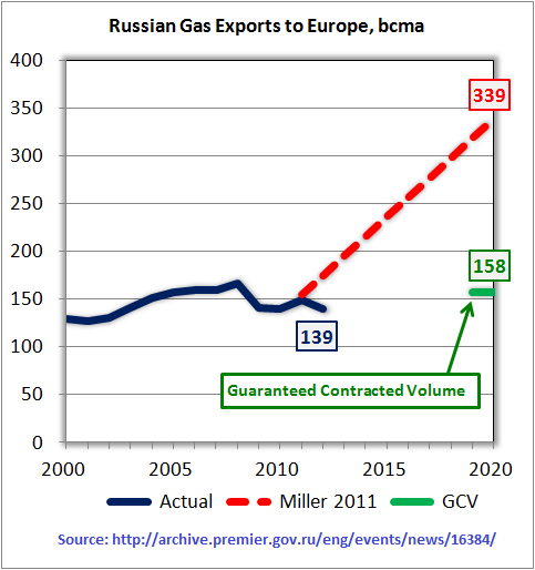 In 2010 and 2011, Gazprom exported to Europe 139 and 150 bcm,