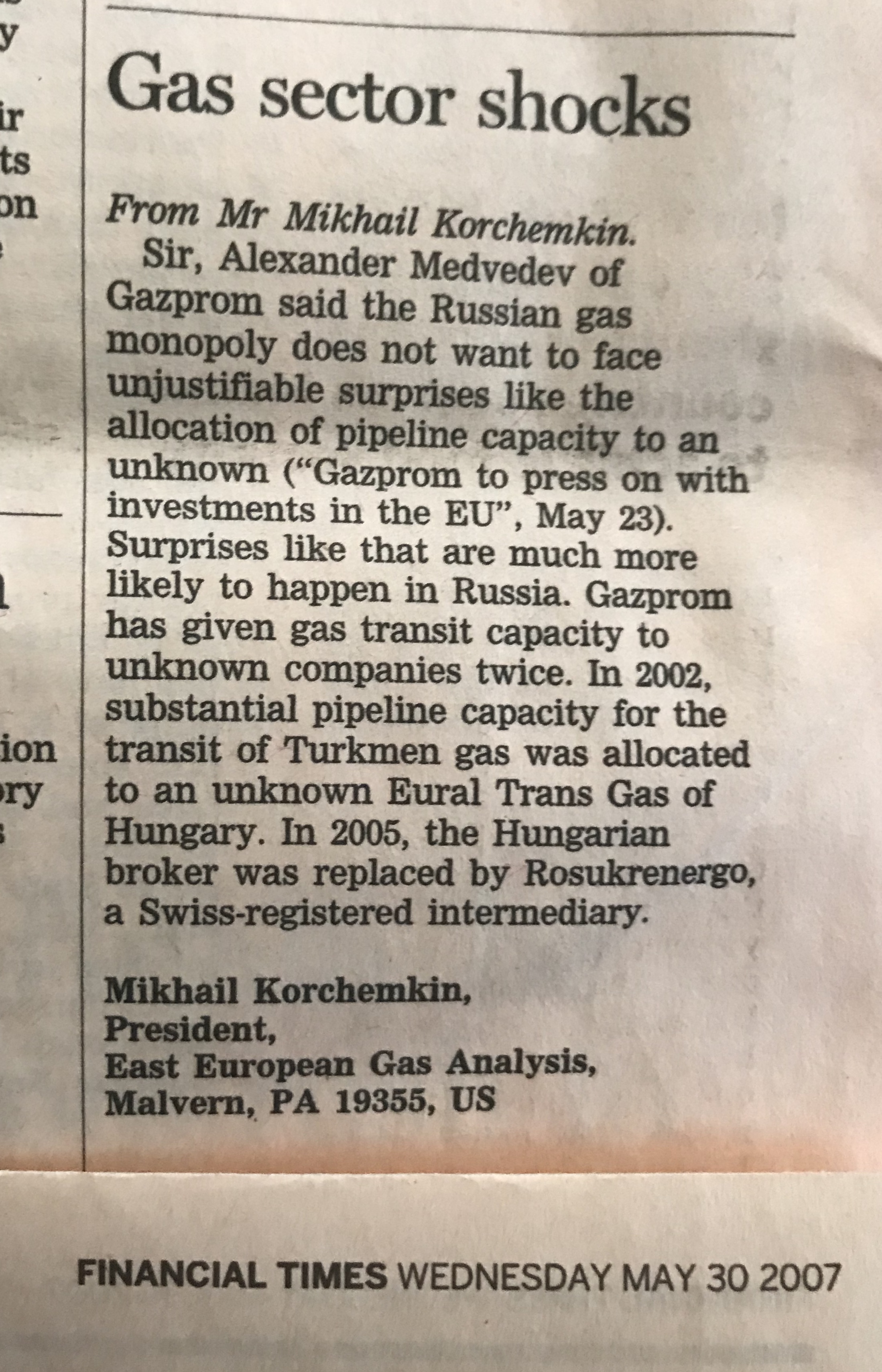 happen in Russia. Gazprom has given gas transit capacity to unknown companies