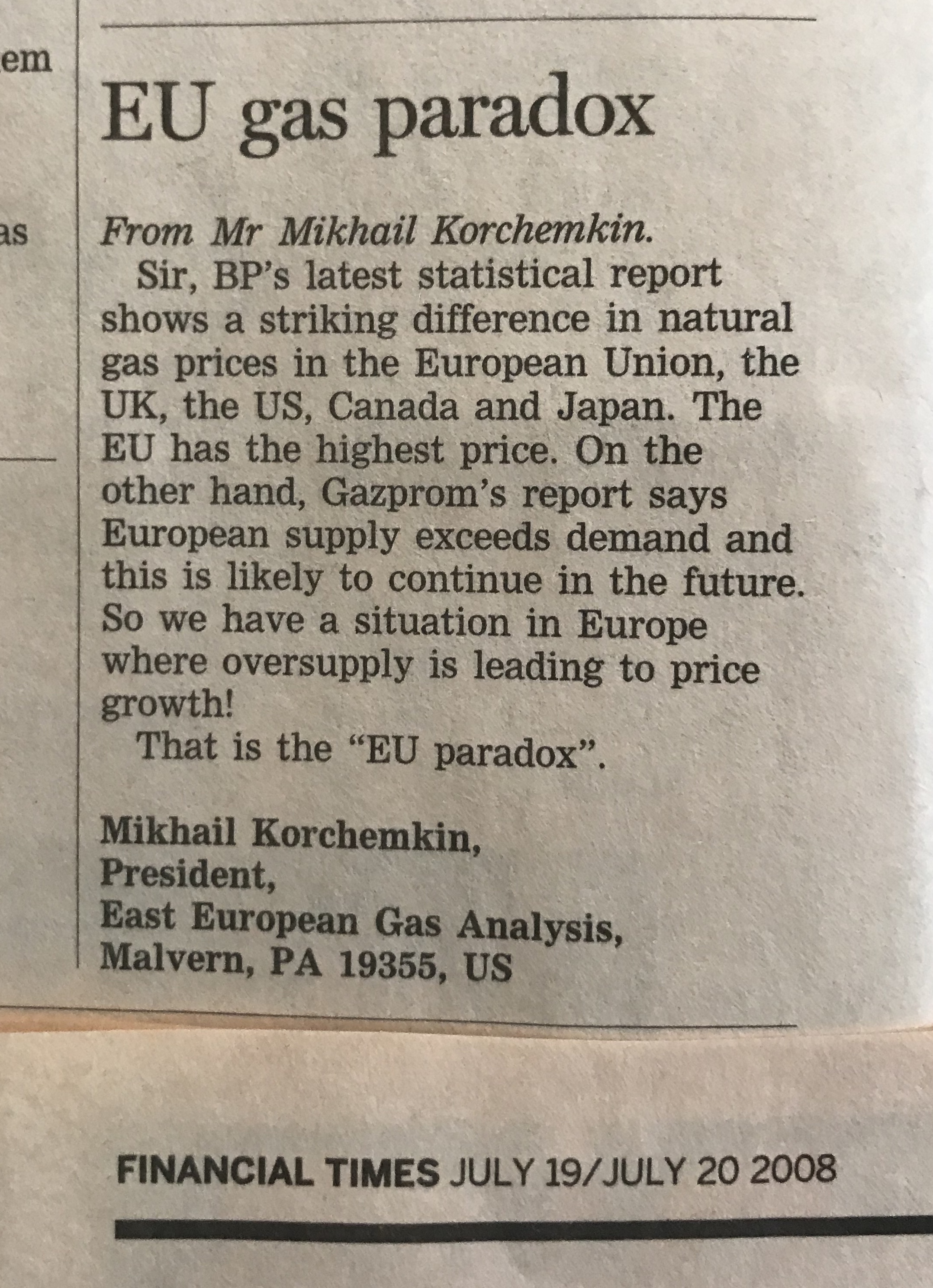 Mikhail Korchemkin’s letter “EU gas paradox” (July 19/20) is that prices in