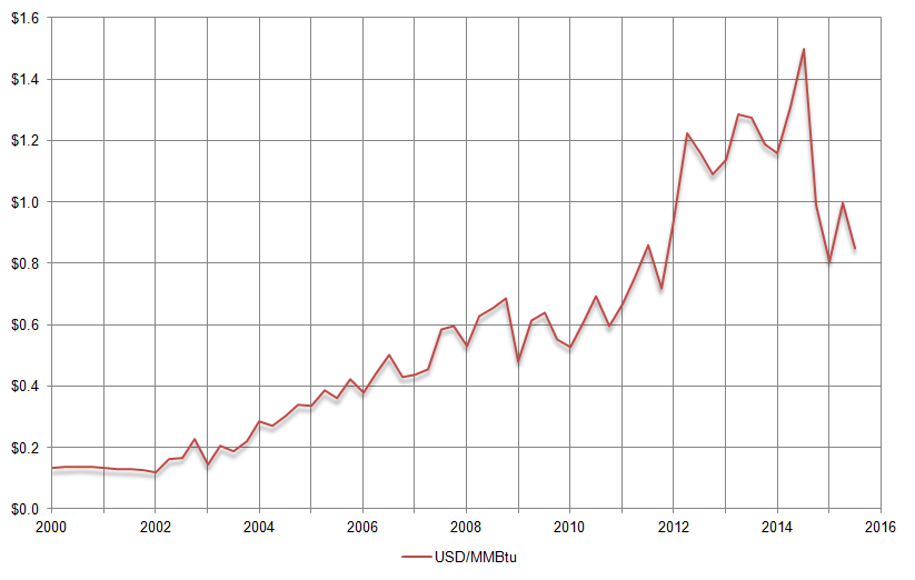 Газпром: Средняя себестоимость добычи газа в 2000-2015 гг.