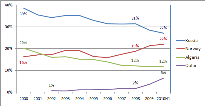 июне 2010 года суммарные поставки Норвегии и Катара были на 10% выше