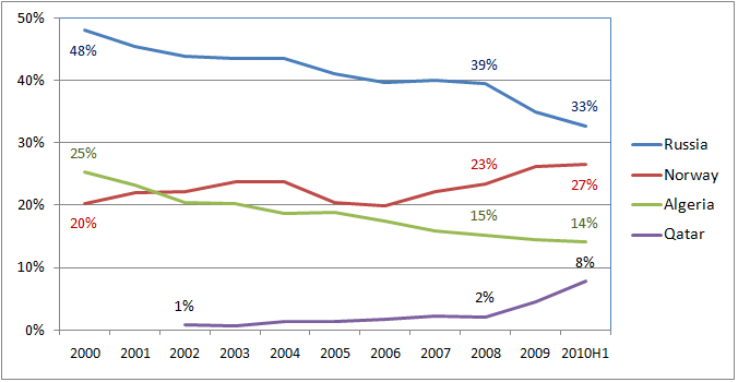 Норвегии, Алжира и Катара в общем объёме импорта газа европейскими